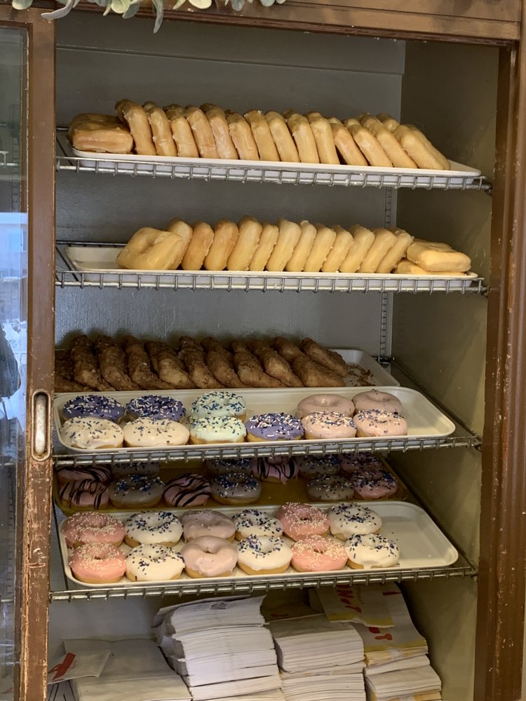Chocolate, Maple, White, Blueberry, Cotton Candy, Raspberry, and Strawberry Iced Donuts.